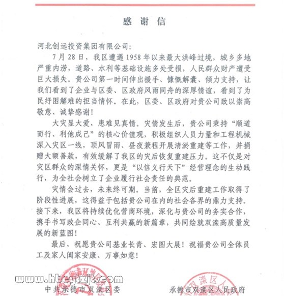 近日,承德市雙灤區(qū)區(qū)委、區(qū)政府向河北創(chuàng)遠(yuǎn)投資集團發(fā)來感謝信,對創(chuàng)遠(yuǎn)集團在今年抗洪搶險期間第一時間伸出援手、與區(qū)委、區(qū)政府和當(dāng)?shù)厝罕婏L(fēng)雨同舟的深厚情誼,表達(dá)了誠摯的感謝。